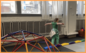 A child swinging on a swing set, their hair flying in the air, while others watch and cheer at The Village Playspace.